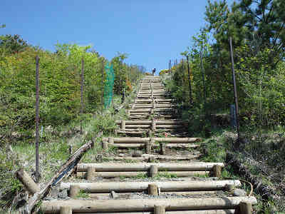 市街地を見晴らす展望地に建つ見晴らし茶屋は、小休止を採るのに一番の場所である。見晴茶屋を過ごせば、足下に大小の岩が目立ち、足場を選びながら高度を上げる。尾根道につけられた横木の階段を辿り、一気に高度を上げると、頭上には新緑が朝日に照らされて映えている。