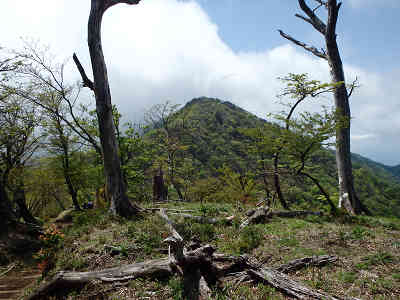 尊仏山莊の左側から「丹沢山へ2.6km」の案内に従い、更に縦走を続ける。坂を下る途中、前方には丹沢山の山頂部が顔を出している。また、その左には蛭ヶ岳へ続く稜線が見えているようだ。尾根道にはシロヤシオが満開で、明るい日差しに透明感のある白い花が映えている。