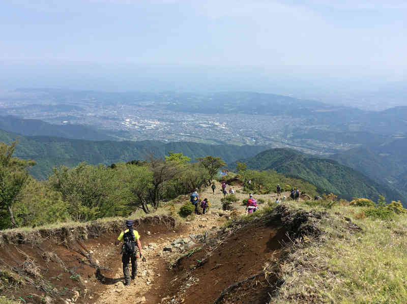 塔ノ岳から800m下った花立山荘上の展望地で小休止、この展望地から眺める大山、眼下に広がる市街地、西にそびえる富士山、北にそびえる塔ノ岳とここから眺める風景は一番印象に残るものである。後は登山口まで標高差1200mを下るのみだが、標高差の大きい山は下るのにも時間のかかるものである。