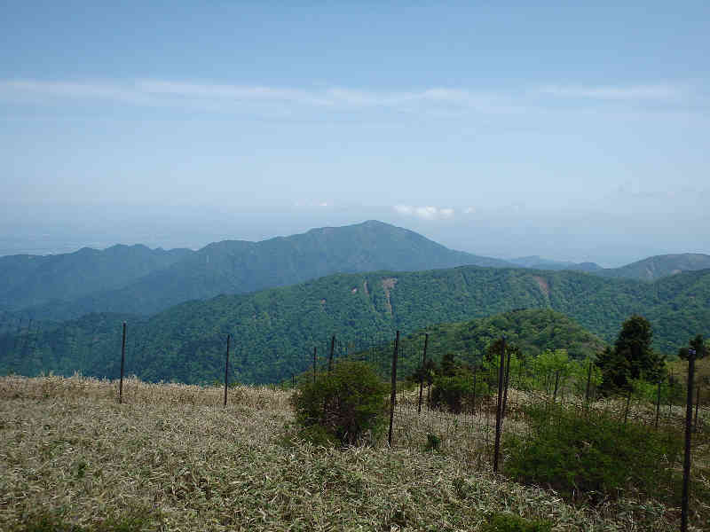 周囲に広がる展望に満足。本日は少々霞気味の展望だが、それでも充分に満足できる展望である。新緑の広がる展望を眺めながら少しずつ高度を上げ、間もなく花立山荘へ到着した。山荘からは富士山が向かいの山裾に広がり、反対側には大山がそびえている。眼下に市街地の広がる素晴らしい展望地なので、ベンチに腰掛けてゆっくり休憩する。