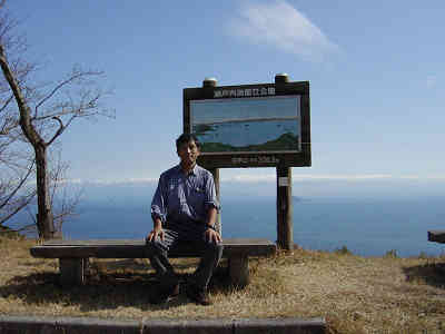 道の駅方面の展望 西には法師崎がくっきりと浮かんでおり、南に目を向ければ松山の工場群の煙突と煙突から出る煙までもすぐ近くに見えた。本当にここからは四国が近いことを実感した。周囲の景色を楽しみながら山頂でゆっくりと昼食を取り休憩した後下山を開始する。