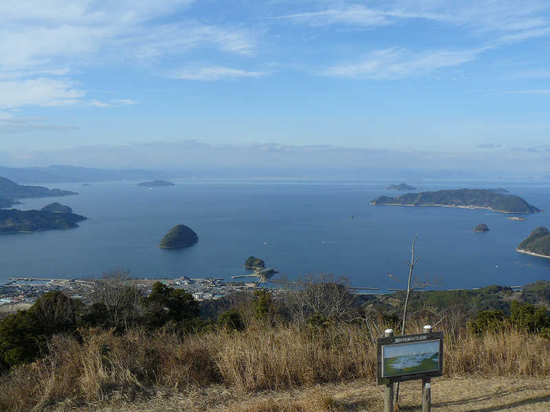 最初から急な坂道が続き息が切れるが、ミカン畑の横を通り進んで行くと登山開始から5分程度で本土側の展望が開けて疲れが吹き飛ぶ。木漏れ日の中をゆっくりと登って行くととても気持ちがよい。