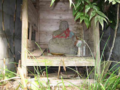 やがて左に錆びついた大型バスを過ごすが、このバスをここまで運ぶのは大変だったのだろうと思う。この先で橋を渡れば登山口まで3km、この先から未舗装道となる。砂利道なので慎重にゆっくり進む。やがて舗装された駐車場に到着、ここには水洗トイレも整備されている。トイレの横には東屋が建ち、その左には安蔵寺観音が鎮座されている。