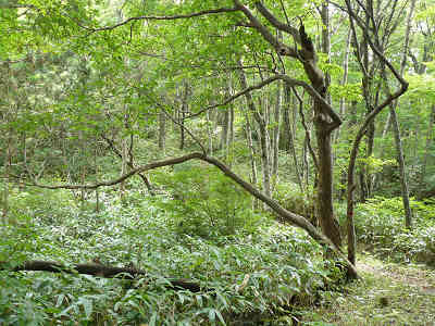 平坦路に着き快適に進んでいると、北九州から来られた登山者と会い、ご挨拶をする。この方より、頭上にクマ棚があるとの説明を受けた。頭上を眺めると、ブナの枝が折られ、木の上に枝が沢山積まれたような場所を見つけることができた。足下にブナの実が散乱しており、何かあるとは思っていたが、クマ棚は初めて見た。このブナの上には何ヶ所もクマ棚があった。