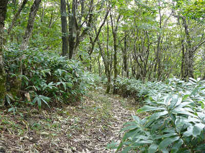 峠を出発、尾根に向かって右側の山腹につけられた道を進む。すぐに登山道は左側に折り返し、尾根沿いを進む。頭上は自然林の青葉に覆われ、まさに緑のシャワーを浴びながら歩いている。広く歩きやすい道は何処までも続き、間もなく高鉢山分かれを通過する。