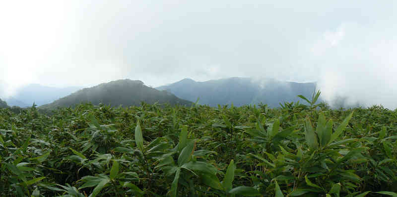 急な坂道の植林帯を登れば、ますます霧は深くなる。植林帯を通過、自然林に入り空が開けてきたが、やはり周囲は霧と雲に包まれて全く展望がない。間もなく坂の傾斜が緩み、左右に笹の広がる登山道を進む。周囲には美しい笹原の草原が広がり、晴れていれば感動的な展望が広がっているものと思われる。