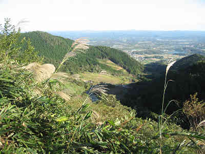 爪ヶ城第三展望所から滝山・那岐山の展望 第三展望所から眼下の展望 南方面を眺めると奈義町・旧勝北町(現津山市)の町並みが美しく、陸上自衛隊日本原演習場も一望であり、そのはるか南には四国の山々が続いている。西の方面には山形仙が美しく、遠く北西方面には蒜山も見えている。しばらく美しい展望を堪能した後、更に下山を続ける。