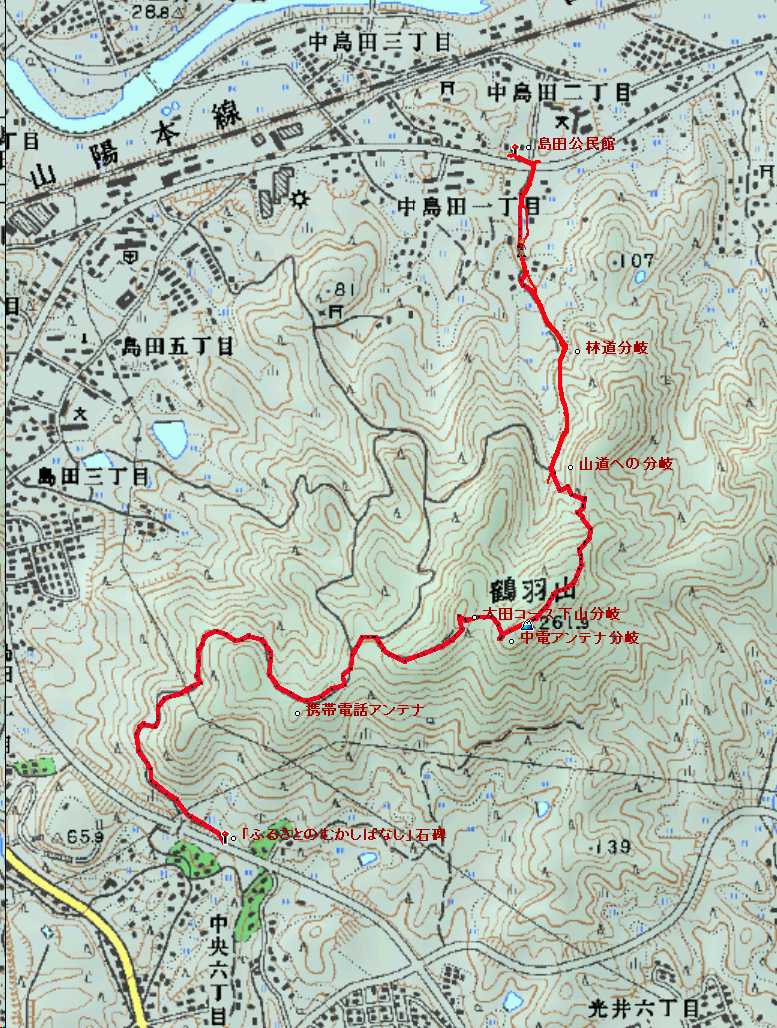 平成17年11月20日(日曜日) 鶴羽山 登山口 島田公民館 ガイド本 金光康資著 防長山野へのいざない 登山開始 9:24 山頂到着 10:03 下山開始 10:32 下山終了 11:05 登山時間 0:39 山頂滞在時間 0:29 下山時間 0:33 所要時間数 1:41 朝から光市中央部に位置する鶴羽山に向かう。稲刈りや田植えの際に何度も見る特徴のあるアンテナ山で、ようやく登る機会が訪れた。登山口は3年間自転車で通った島田中学校横の島田公民館、公民館の駐車場に駐車しておけば安心して登ることができる。島田公民館から島田中学校側に少し坂を降りると南に向かって登る舗装道があり、電柱の側には鶴羽山登山口(太田コース)の道標が立っている。
