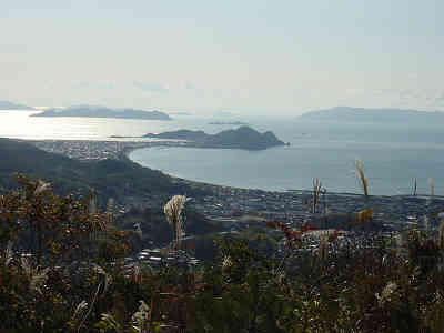 程なく尾根道に到着し左右を見るといつの間にか植林帯は檜林に変わっている。そのまま尾根を進むと周囲の木々がだんだん低くなり、登山開始からは30分でようやく暗い森から出て明るい尾根道歩きとなる。 すぐに目の前には展望が広がり、北の方から玖珂の物見ヶ岳・蓮華山から高照寺山、東は呉麓山・琴石山・大星山までの展望が開けてきた。素晴らしい展望に感激、しばらく立ち止まり展望を楽しむ。
