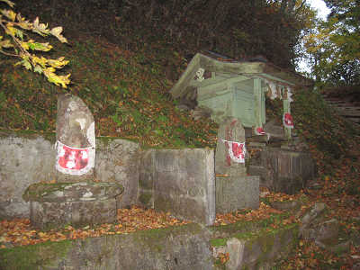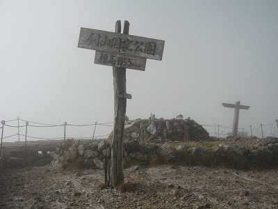 待てよ・・・・、今までの自己最高地点は大山の1710m、この時点で自己の最高地点を更新中ということになる。なんだかとっても嬉しい。神社の後ろには特徴的な大岩が立っているのだが、霧でよく見えないのが残念だ。大剣神社に参拝して更に山頂を目指す事にした。