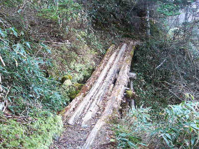 一の森から南の展望 一の森から剣山の山頂を眺めながらゆっくりと笹の原を滑らないよう、慎重に分岐まで下りて行く。この分岐の指導標によると、行場へ1230mと書いてある。分岐を右に取り、細い道をどんどん進むが右手は崖なので焦らず進むことにする。途中には頼りない橋もあり、慎重に進まないといけない。