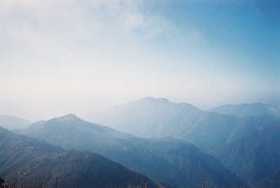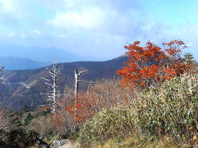 次郎笈山頂から南西方面の展望 素晴らしい展望を眼下に見ながら下りて行く。デジカメがないのがなんとも情けない。しっかりと美しい映像を記憶しながら急な坂を下りて行く。滑りやすい道を慎重に下りて行き、途中で三嶺の縦走路に紅葉のきれいな場所を見たので少し寄り道をする。縦走路を少し進みきれいな紅葉を鑑賞した後、縦走路に戻った。