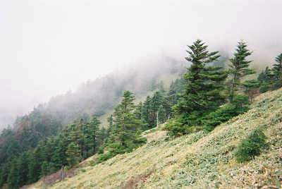 霧が深いものだから自分が何処にいるのか判らない。注意しながら急な坂を下りていると次第に霧が晴れてきた。後ろを振り返ると剣山の方面には依然と霧が掛かっている。正面に美しい稜線の次郎笈を見る、素晴らしい。緑の草原という感じだ。