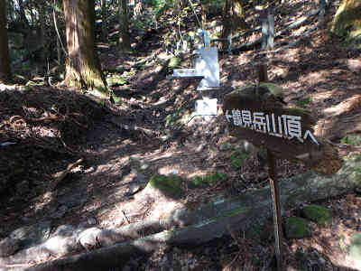 間もなく正面に見えている尾根がはっきり見えてきた。どうも岩場が崩落しているようだ。これは地震による被害かも知れない。間もなく左下へ続く分岐が現れ、この分岐を左折して御嶽権現社へ続く道へ入る。案内によれば、鞍ヶ戸・船底・内山を経由して大平山及び塚原方面へ向かう登山道は崩壊しているようだ。