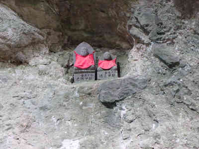 山腹につけられた道は狭くなっており、スリップしないよう慎重に進む。右側の岩の迫る箇所には補助の鎖が渡してあり、鎖を伝いながら進めば安全だ。大岩の点在する谷を進むと2番の石仏を通過、この先で3番の案内が置かれ、左上へ進むよう示されていた。