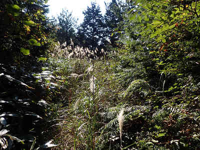 やがて最初の登山道入口に着く。入口から上を見ると松の木が立っていた。次にもう少し先へ進みもう一つの入口を確認。こちらは入口から笹が茂っているものの、笹の背は低そうだ。地図を見れば最初の取り付き点は一旦尾根へ出て東へ移動、この取り付き点は直接北へ進む感じで、両方とも途中で合流する。