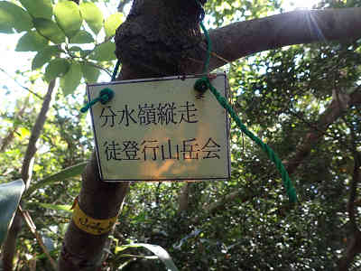 周囲に背の高い枝が多いのでテープがとても良く見えるため、帰路は完全に保証されている。そのまま北への移動が終わり、東へ向かって尾根道をとる。この付近の手前から背丈以上の笹藪が始り、進路が全く見えない状態で西へ進む。