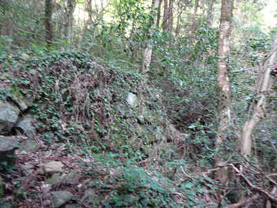 南へ向かって進路をとり民家を過ごせば作業道に入る。頭上に萩三隅道路を過ごし作業道は右へカーブするが、登山道は直進方向なので注意が必要である。山道に入り細い道を辿れば右に堰堤を過ごす。更に進み石組みの目立つ場所に着き進路が左右に分岐する。