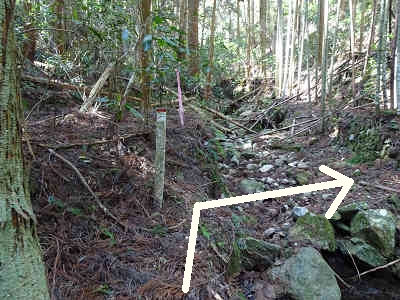 私はそのまま急登にとりつき、最後で左側の尾根沿いに進み、広い作業道に飛び出た。すると、もう少し左側から明確な巡視路が続いており、無駄な労力を費やしたことに気づいた。