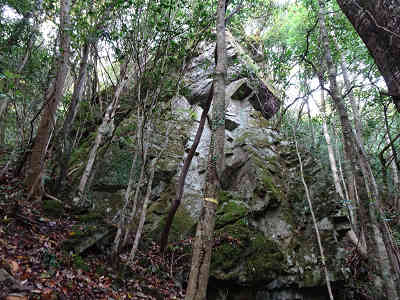 一度に5名が限度と言う広さの岩に向かってロープを伝って下りてみた。岩壁にはセッコクが多く残っていたので6月頃には白い可憐な花を咲かせるのだろう。ただし松の木に咲いていたセッコクは無くなってしまったようだ。セッコク岩から重塀岩などを眺め、ロープを伝って展望岩まで引き返した。