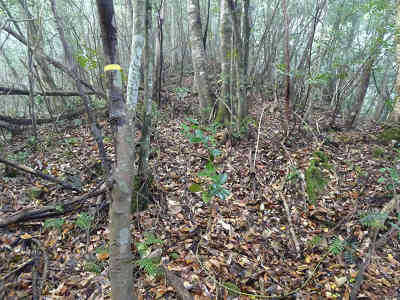 ツルマンリョウ・シャクナゲの案内を過ごし、少し足下が歩きやすくなった。坂の傾斜を感じながら尾根へ向かって高度を上げる。やがて突然という感じで左右に続く水平道に着いた。これで一安心で、ここまで一度も道を間違えることは無かった。それだけ慎重にルートを探していたと言うことだろう。