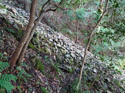 時刻は少し早いようだが展望を眺めながら昼食を摂り、展望岩を出発した。分岐まで引き返し快適な道を西へ向かう。進路は途中から一旦北へ向き、やがて南へ向かってつづら折れの生活道を下る。基礎の石組みがきれいに残っており、かつては牛馬が荷物を運んだと言われている。