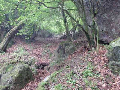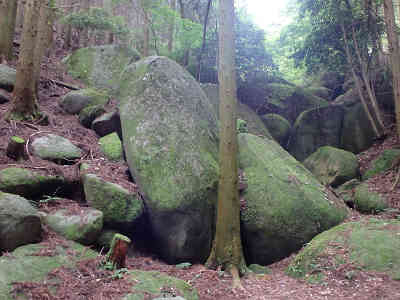 山腹につけられた道を辿れば、やがて風岩と呼ばれる場所へ着く。苔むした大岩の間から涼しげな風が吹いているようだ。周囲に大岩を鑑賞しながら少しずつ高度を上げると、間もなく寄添い岩を鑑賞、奇岩巡りがとても楽しい。この先で作業道と出会うが、すぐに左側から山道に戻る。 杉の美林を眺めながら高度を上げていると、再び作業道へ出る。作業道からは左にぶな尾根コースが分岐しているが、私はそのまま作業道を辿った。すると、左側へ登山道の案内が現れた。ロープの渡された苔むす岩上を通過し、植林帯の下に続く急登へ向かう。