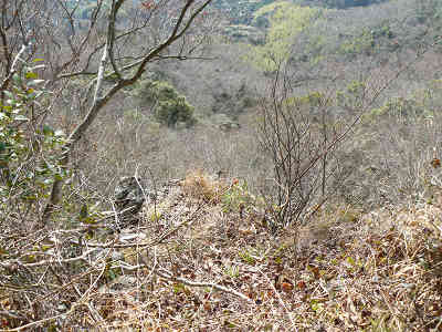 やがて鞍部に着き登り返すが、この付近で倒木を迂回、再び尾根につけられた踏み跡をたどる。樹林の中に集塊岩を眺めながら進み、伐採地と自然林の境界付近の歩きやすいところを探しながら進む。伐採地は明るいのだが、茨がひどく、苦労しながら高度を上げている。