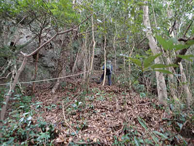 更に進むと左側が明るくなり、樹林の間を分けて海側へ移動すると、瀬戸内海や平郡島、更に四国までの展望が開けていた。ただし、眼下は絶壁なので少し腰が引ける。平坦な道が続いた後で坂の傾斜が強まるが、補助のロープが渡してあるため苦労することはない。