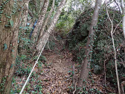 赤テープの案内に従い明確な道を辿る。すぐに坂の傾斜がきつくなり、足下には岩などが増えてきた。登山道自体は明確で、何の問題も無く、集塊岩が見えてくれば標高444mを過ごす。
