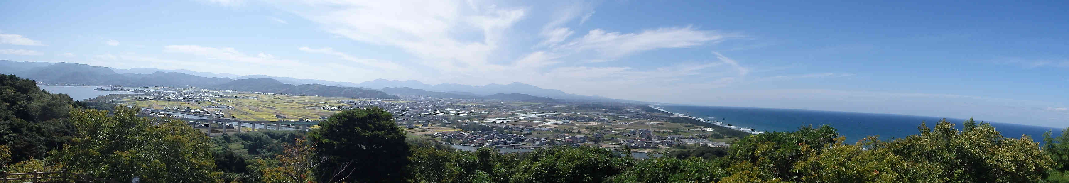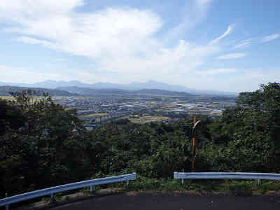 山頂へはわずかな坂を登れば到着、山頂には橋津古墳群の白い標柱と二等三角点が置かれている。山頂からは北にハワイ風土記館と日本海を眺めることができるものの、東郷池方面は周囲に木々の背が高く、展望を得ることはできなかった。せっかくなので、北西に見えているハワイ風土記館へ向かうことにした。 右に古墳を眺めながら舗装道を進むと、わずかで風土記館へ到着、ここは周囲を見晴らす展望台になっており、北に日本海、西から南西に掛けて孝霊山、船上山、甲ヶ山、矢筈ヶ山、大山、烏ヶ山、皆ヶ山、蒜山三座と名峰がずらり勢揃い。 眼下には、東郷池に浮かぶ羽合温泉もしっかり眺めることができた。しばらく展望台からの景色を楽しんだ後、元来た道を引き返しテニスコートの駐車場まで下り立った。