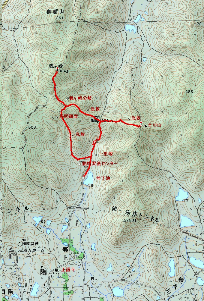 足下には滑りやすいゴロ石が転がっており、滑らないように慎重に降りて行く。登山道自体は明確で、目印がしっかりとしているため私のような初心者でも迷うことはないものと思われる。急な坂をゆっくりと降りて行くと「馬頭観音まで250m」の案内版を右に見る。少し坂が緩やかになるかと思ったらまだまだ急な下り坂が続く。 「馬頭観音まで250m」標識を過ぎて3分で沢を超え、更に10分程度で動物愛護センター横に到着した。そのまま整備された道を降りて行き、登山口である一里塚を左に見て登山を終了した。 陶垰下の一里塚を見て登山開始、陶垰から魚切山を往復し、狐ヶ峰に至り、最後に馬頭観音に参拝するこのコースは展望のみならず、歴史も感じる素晴らしい一周まわりの縦走路だった。