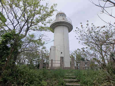 分岐まで引き返し、更に整備された遊歩道を進むと遠くに灯台が見えてきた。背後には網代の集落が見えており、狭い地域に肩寄せ合って住んでいるようだ。しばらく展望の無い遊歩道を進んでいたら、突然という感じで白い灯台が現れた。
