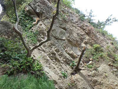 分岐まで引き返すと千貫松島の案内があり、岩によりくり抜かれた海食洞門が説明されていた。目の前にある大岩は周囲50m、高さ25mである。岩の奥には松が生えており、この生命力には驚いた。この先の民家前には展望所があり、先程の千貫松島が手前に見え、海岸まで下りられるようになっていた。