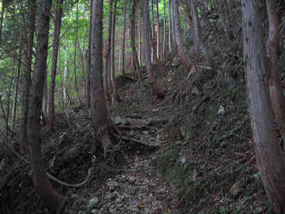 あいたた!・・・・、従って道を間違えたという確信を持って引き返し、沢を左方向に渡って正しい道を確認することになった。ロスタイムとしては約5分である。その先再び沢を左から右に渡り返す手前の標識には、後山分岐まで1200mと書いてある。この付近からは少しずつ山腹をゆっくりとジグザグに縫うように進むことになるが、傾斜自体は緩やかで大きな疲労感はない。