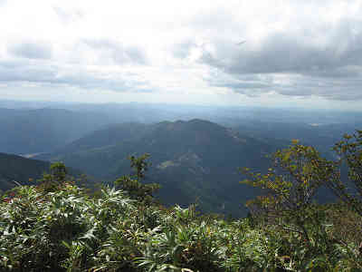 分岐を右に取り進むとすぐに登山口で出会った先行の2名の女性登山者が朝食を取っていたので先に行くことにした。すぐに船木山頂上とちくさ高原の標識があり、記念撮影をする。南の方面には素晴らしい展望が広がっているがネマガリタケの背が高いので少し邪魔な感じがするが、目の前の日名倉山は美しい姿をしていることがわかる。