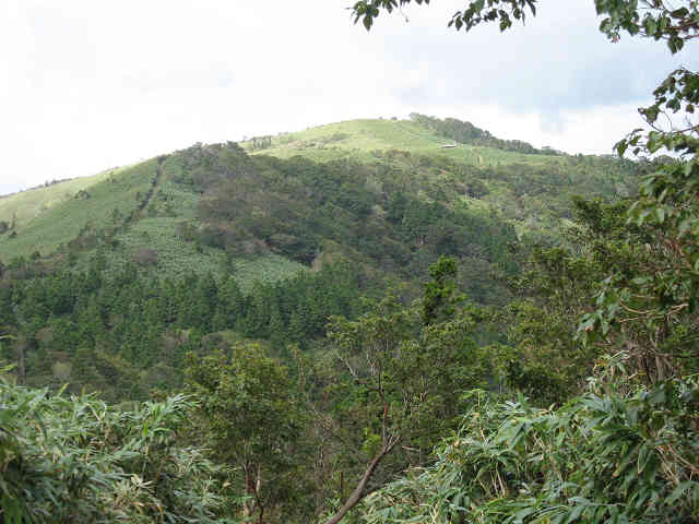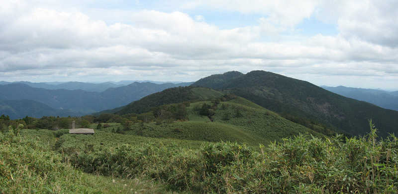 船木山と後山の展望 出発間際に神戸から来たという登山者が上がってきたので記念写真のお手伝いをして下山を開始した。駒の尾山を降りるとすぐに鍋ヶ谷山・船木山・後山の稜線が素晴らしく、隣の日名倉山にかけての展望に思わず立ちつくしてしまう。素晴らしい展望を楽しみながら少しずつ下りて行くことにした。避難小屋を過ごし、まずは鍋ヶ谷山に向かって進んで行く。笹の中に縦走路が一本の線のように見えている。