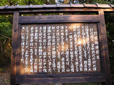 打吹山山頂風景 山頂には平成19年1月に倉吉市により設置された「打吹山を楽しむ」の説明板が立っており、昭和61年に「森林浴の森百選」に選ばれたことなどが書いてある。広い山頂の北側には打吹城址の石碑が置かれ、打吹城についての由緒などが石碑に彫られている。山頂にてゆっくりと静かな時を過ごしたのでそろそろ下山を開始する。