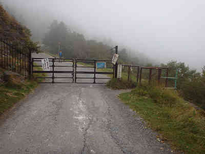 霧の立ちこめる林道に入り、まずは松本市街を見晴らす王ヶ鼻を目指す。なお、最高峰の王ヶ頭までは1km、王ヶ頭を経て美しの塔までは3.1kmである。進路を北に採り、霧で視界の遮られた作業道を進む。間もなく天狗の露地と案内される分岐へ着き、進路を左に採れば王ヶ頭への近道なのだが、先に王ヶ鼻を目指すのでそのまま作業道を直進する。