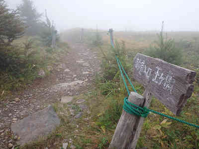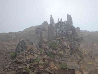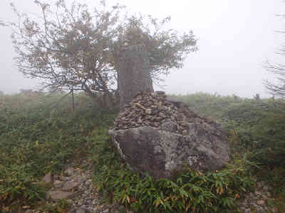 三等三角点の置かれた山頂からは、周囲に霧が深く、全く展望がない。そこで、せめて山頂に着いた証しとして周囲の写真を撮る。大岩に刻まれた「美ヶ原頂上王ヶ頭2034m」のモニュメントを眺め、左に不動明王、更に左にも石像が祀られている。