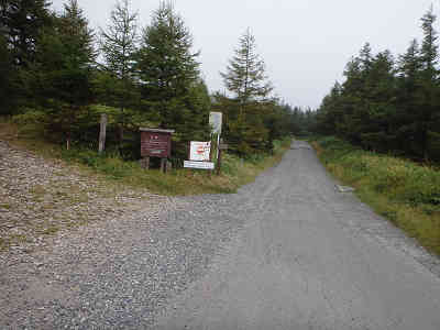 間もなく「許可車以外は進入禁止」の車止めを通過、左右を植林帯に囲まれた作業道を更に進むと、本線は大きく左にカーブする。この起点の分岐を右に採り、王ヶ鼻へ0.5kmの案内を確認する。なお、最高峰の王ヶ頭へは0.7kmの距離で、登山口からは1.2km地点である。