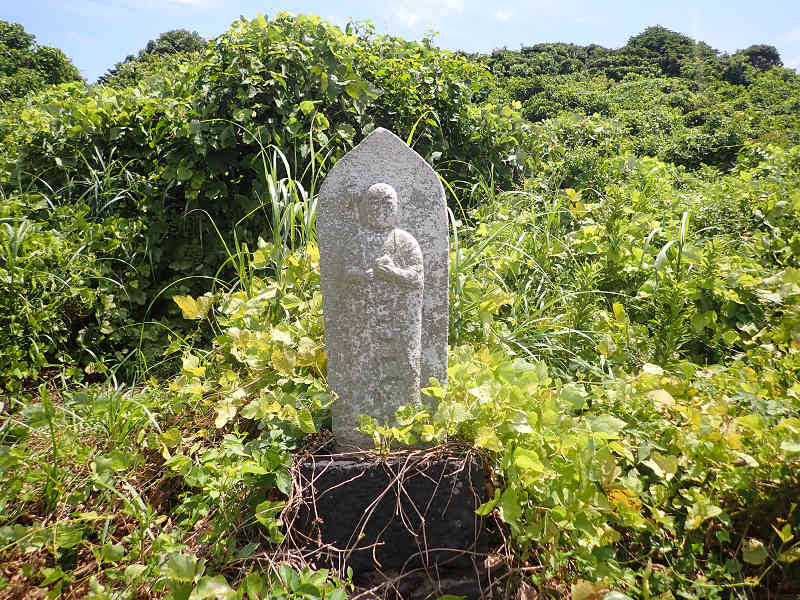 そこで分岐を右折、海を見晴らす展望地の手前に大井鵜山魚付保安林植栽記念の柱が立っていた。眼下には特徴的な岩が続き、エメラルドブルーの海の先には平坦な大島が浮かんでいる。周囲を眺めると海側に白い石のようなものが見えた。たぶんこれが白地蔵だろうと思い、踏跡をたどると海の方を向いた白地蔵に着いた。