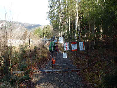 すぐに現れる分岐は左の道を採り、右に墓地を過ごすと六地蔵が迎えてくれる。更に未舗装道を進むと、イノシシ除けの柵が現れるので鍵を開けて入る。この奥にも同様の柵があるので再度鍵を開けて中に入る。頭上を覆う樹林は自然林に変わり、青空が覗いているのでとてもさわやかな気分である。但し、年末の登山なので吹く風はとても冷たい。