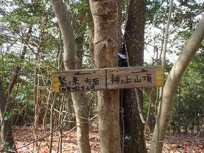 そこで、菖蒲池の分岐からは、案内に従い左折する。そのまま明確な登山道を進むと左に竜王山・和気富士への縦走路が見えてくる。こちらの方面には、神ノ上山の山頂を踏んだ後、向かうことにする。そのまま緩やかな傾斜の道を辿ればまもなく三等三角点の置かれた神ノ上山の山頂へ到着、 山頂の右には荒廃した小屋が建っていた。