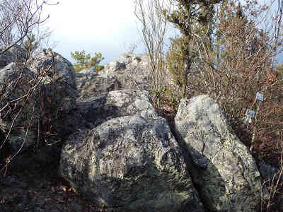 やがて右方向が開けてくると毎年8月16日に「和」の字のかがり火が焚かれる火床が見えてくる。このピークの観音山を通過し、少し下ると「和」の字の中へ向かう道、和気地区へ下る道へそれぞれ分岐している。この先で岩が目立つ場所へ着くとエボシ岩の案内があり、眼下には吉井川が近く、和気富士がとても近くなっている。