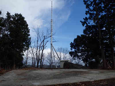 神ノ上山山頂 神ノ上山から眺める風景 さて、広く平坦な山頂からは、東に吉田駅方面、その先に兵庫県赤穂市の山脈が広がっている。北に目をやれば、眼下に集落が並び、遠く中国山地には那岐山がそびえている。真冬の山頂には冷たい風が吹いており、恒例の記念撮影の後、服を着て周囲を散策。山頂手前には登山ノートがあったので、名前のみを記入しておいた。時刻は丁度12時だが、風のないところまで移動して昼食を摂ることにした。