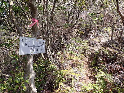 三等三角点の置かれた山頂で小休止の後、山上山へ向かう縦走路に入る。山頂から東へ向かうと左右に分岐があり、右は牟礼峠へ続く道で、左が石鎚神社、山上山へ向かう道である。手製の標識には北方展望台3分、石鎚神社・山上山・一ノ瀬、石原と書かれていた。