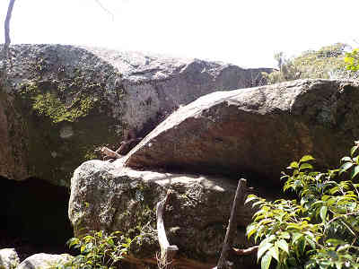 更に高度を上げれば右に鉾岩へ続く分岐が現れる。鉾岩へ向かって右下へ続く道に入り、道なりに進むと大きな鉾岩の前に着いた。山陽自動車道を走っていると、矢筈ヶ岳に大きな岩が見えているが、それがこの鉾岩である。