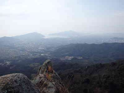 敷山神社の祠に参拝し、西へ続く登山道へ入る。登山道は急に滑りやすくなり、すぐに岩場の急登が始まるので、ロープと木々を補助に慎重に高度を上げる。やがて左右の分岐が現れ。左は西峰への直登、右は迂回路である。ここでは左の直登道を採り、岩の間を抜ければ、展望の岩上に着く。 平坦な岩上からは眼下に防府市街の展望が広がり、瀬戸に浮かぶ向島なども美しい風景を見せている。北西にも樹間越しながらに三谷山などの展望が広がり、大岩上からの展望は素晴らしい。岩上にて小休止の後、山頂へ向かって出発する。
