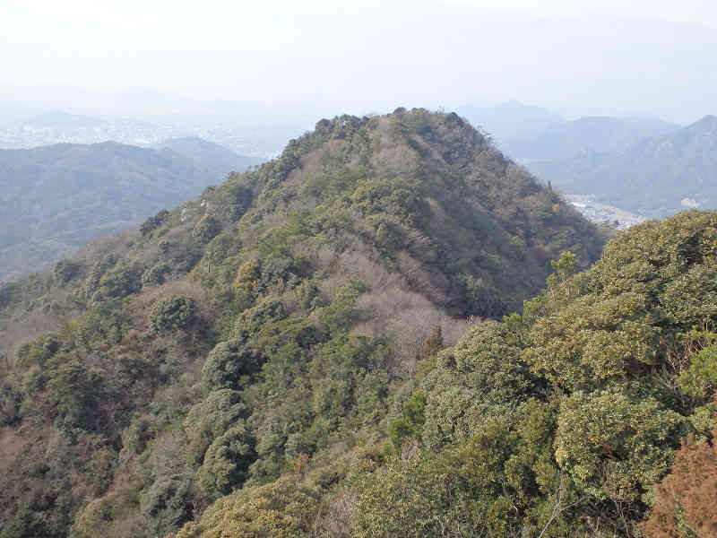 大岩から北東方面へわずかに移動すれば、左に森林公園からの登山道が分岐している。この先で右へ敷山城址への下山道を過ごし、尾根道を進むと正面に大岩群が現れる。この大岩は右へ迂回して過ごし、わずかに高度を下げた後、鞍部から岩場の急斜面を登り返す。背後には先ほどまで立っていた双耳峰の西峰が美しい山容を現し、南には防府市街と瀬戸内海の展望が美しい。 坂の傾斜は登るほどに険しくなり、補助のロープを伝って一気に高度を上げる。やがて斜度がゆるめば、右に分岐が現れる。この分岐こそが、山陽道から矢筈ヶ岳を眺めた際、山頂付近に見えている鉾岩へ向かう道である。麓からでも目立つ大岩は、近くで眺めると更に大きい。 この岩上に立ち、眼下に広がる展望を眺めることは、この矢筈ヶ岳登山一番の醍醐味である。おっかなびっくりで岩上に立ち、眺める展望は素晴らしい。南峰から眼下に防府市街と瀬戸内海、東には大平山とパノラマが広がる。 素晴らしい展望を満喫したので、登山道まで引き返し、更に尾根道を辿れば三等三角点の置かれた矢筈ヶ岳山頂へ着く。周囲を木々に覆われた山頂からは、唯一大平山方面のみ展望が開けている。静かな山頂から大平山の展望を眺めて下山を開始した。